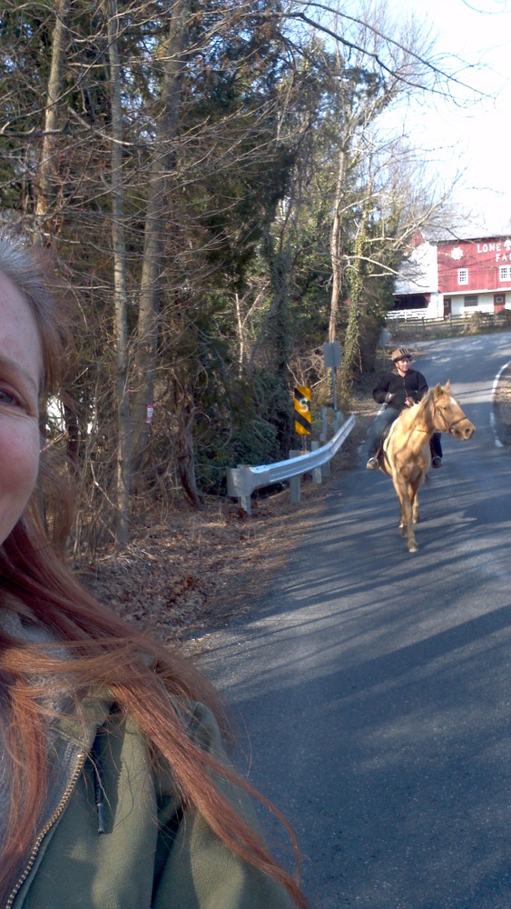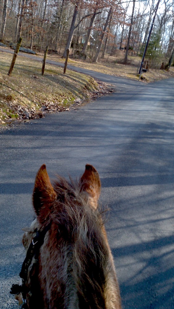 Cuervo and Apple went out for a trial ride. It was a beautiful day for mid February. Apple was hyper and loved being out. Cuervo was Mr slow poke and acting like Eeore.