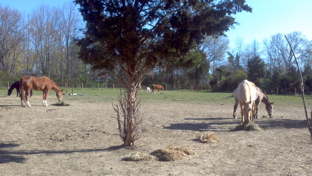 Easter morning, just like every other morning, the horses are enjoying their hay in the pasture.