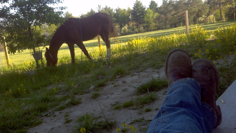 On Saturday Mugsy learns how to ride. Casey continues his getting back into shape. I learn how to drive my tractor and cut the back pasture. It ends with Casey trimming the grass while I finally get to put my feet up. Great, productive week end at the GSF. Thanks to my friends who helped set up the tractor and did all the barn work.