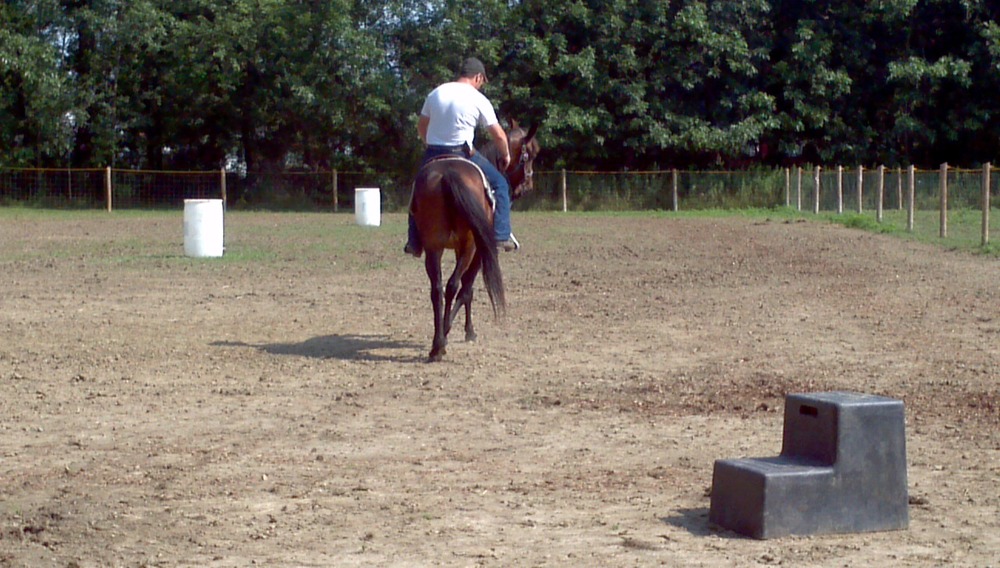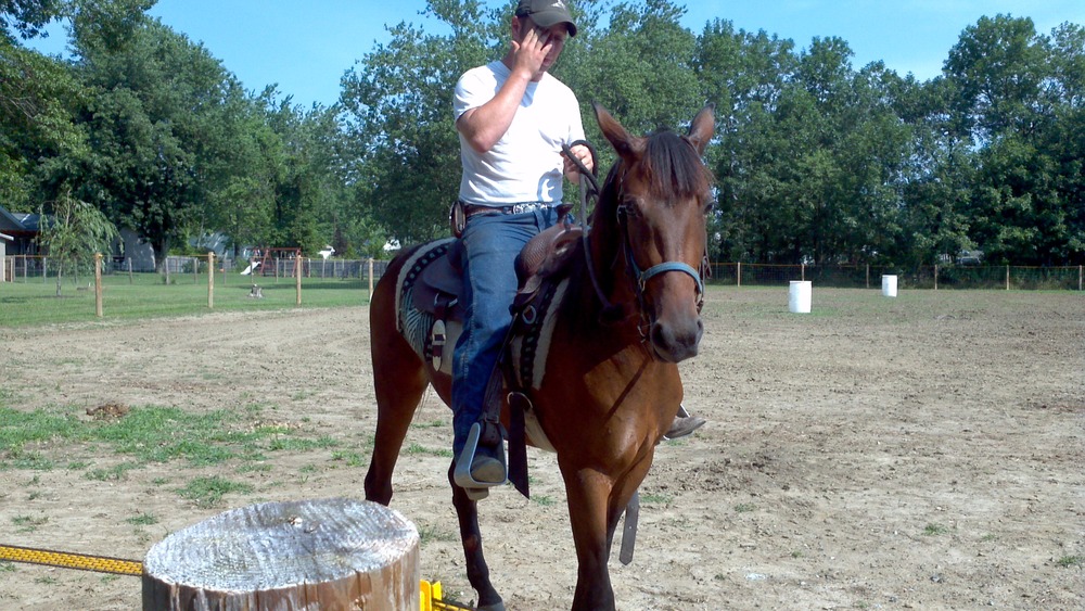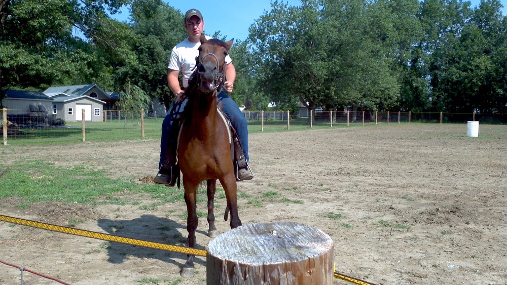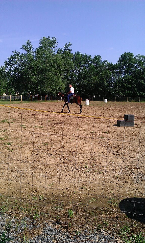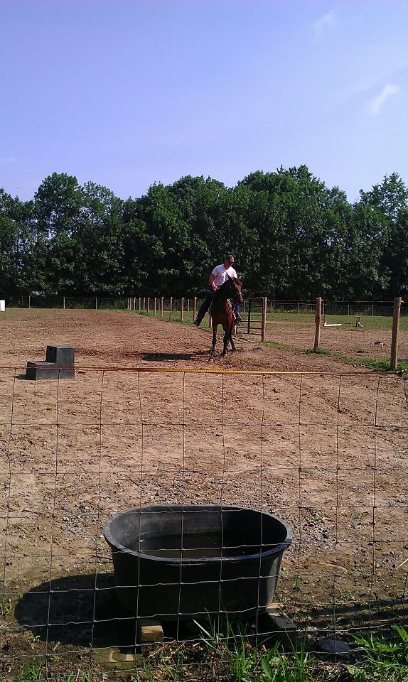 Meet Carrie, Mitch’s new project. She is a standard bred born and raised for harness racing. (http://en.wikipedia.org/wiki/Harness_racing) Before her big career, she is being trained here for ground manners, and even to ride. This pics are from Mitch starting to break her, it is the first time she has ever had any one on her back and she did really well.