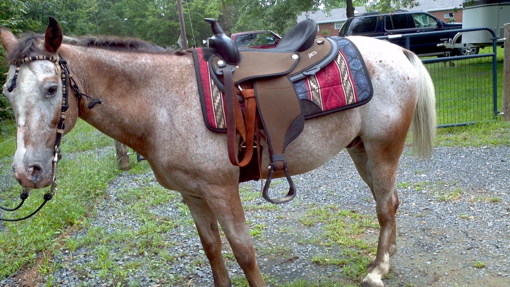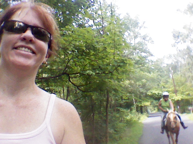 My 6th day of riding in a row. Apple did not look that enthused to be leaving his hay. It was my usual 10am lesson, which we decided to do as a trail ride instead.