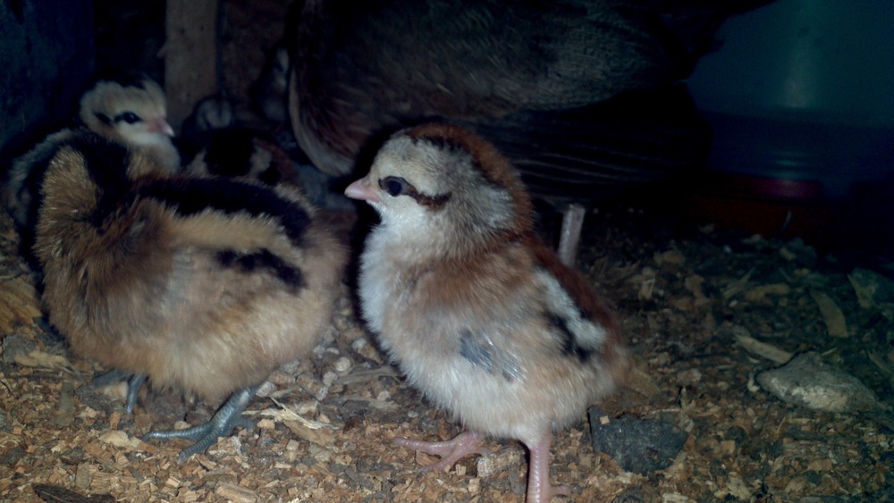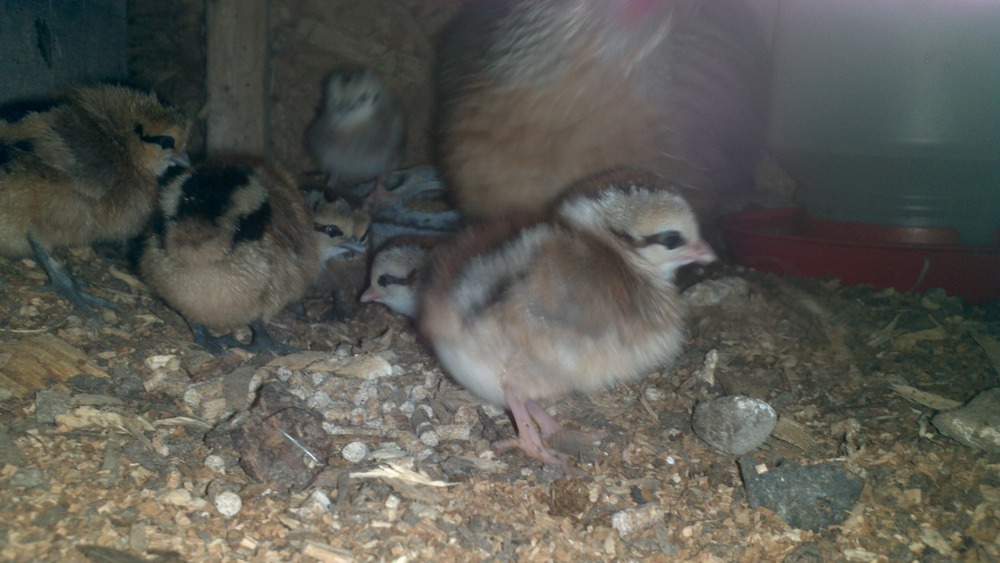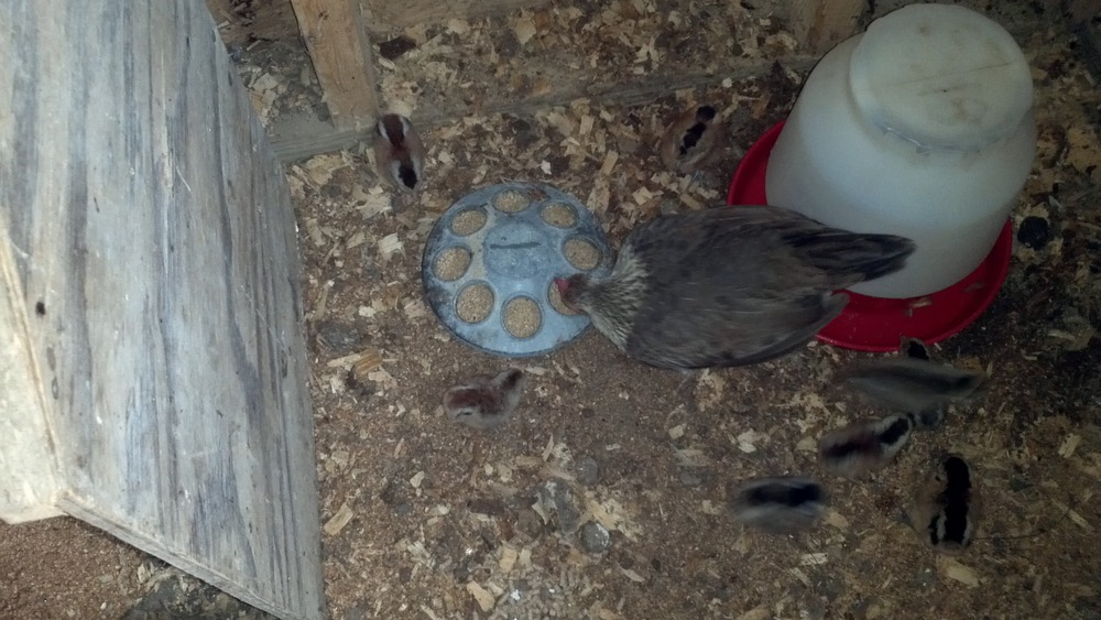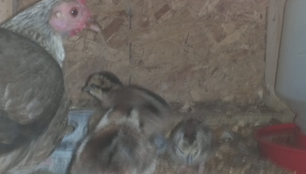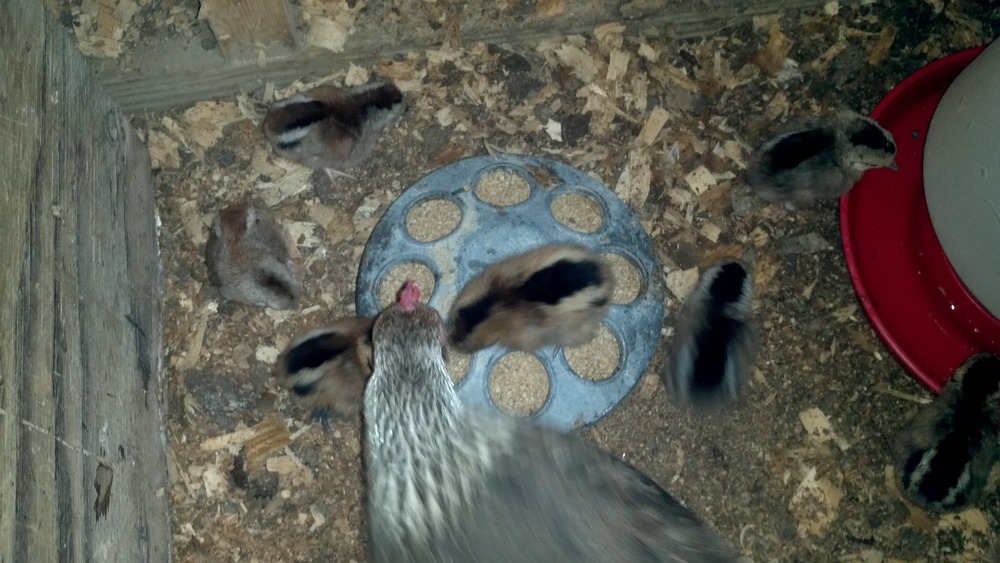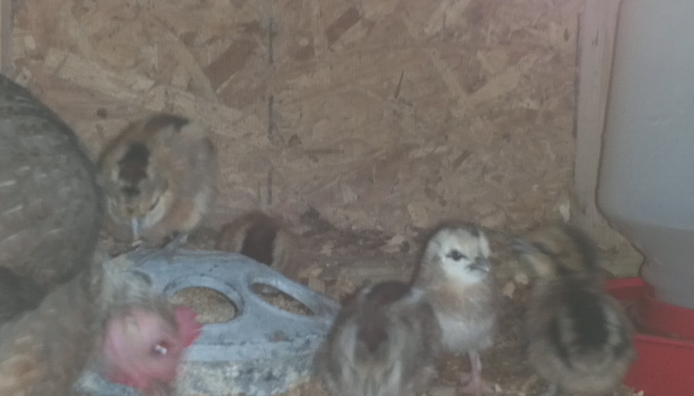 I noticed the little grey bantam hen was not laying eggs, until I found her hidden clutch of them behind the nesting box. She chirped one day and gave away her location. Since she had already started to lay on then I decided to let them hatch. Thinking there would be a few at most. Well last week we had 8 chicks hatch! They are very cute and she is such a good mother hen. We separated them from the adults by giving them thier own section of the chicken coop. Last week, I found a home for five of them and decided to keep a few to watch them grow, replace some that we had lost to a fox and not upset mama hen too much by taking all her babies away.
