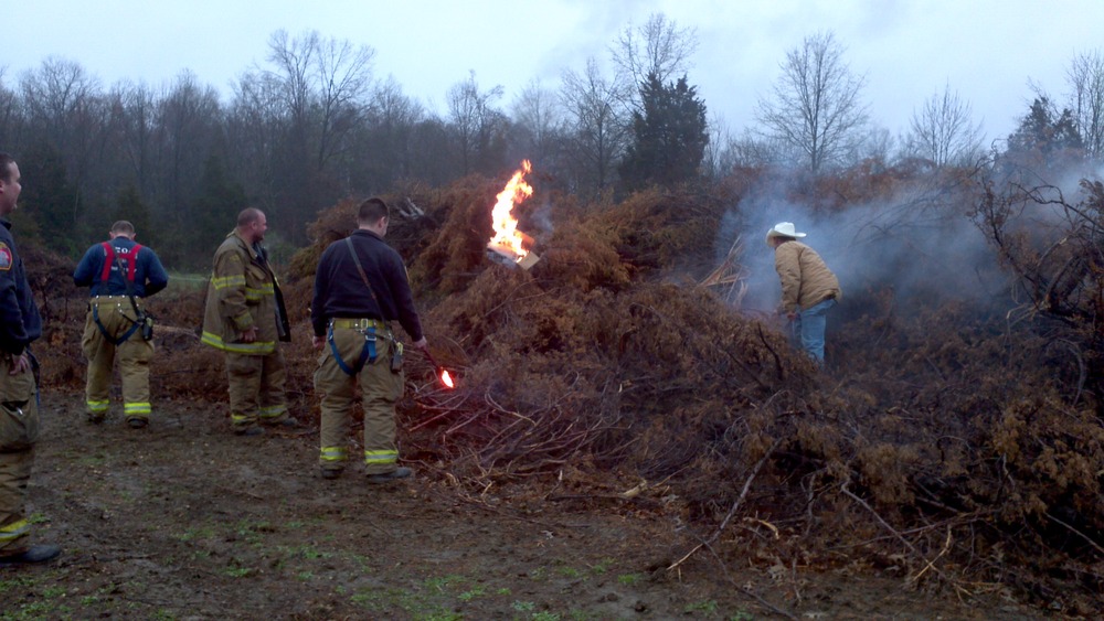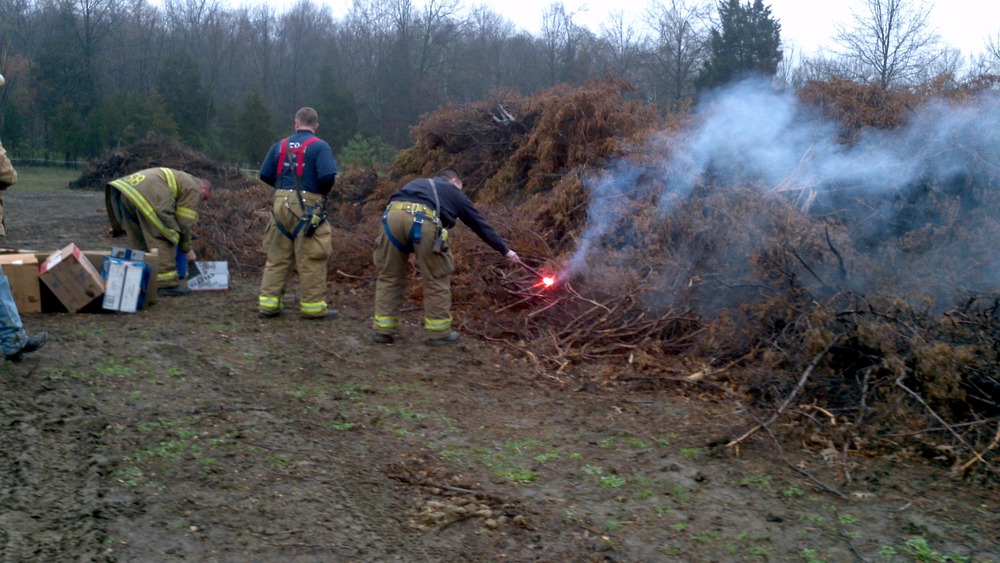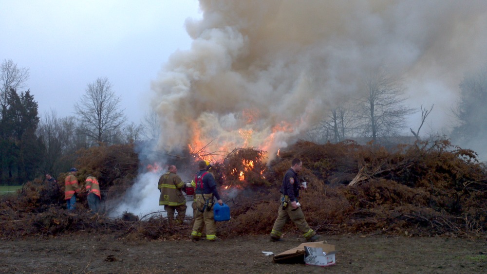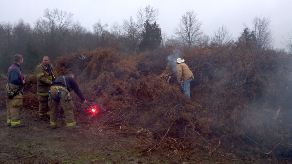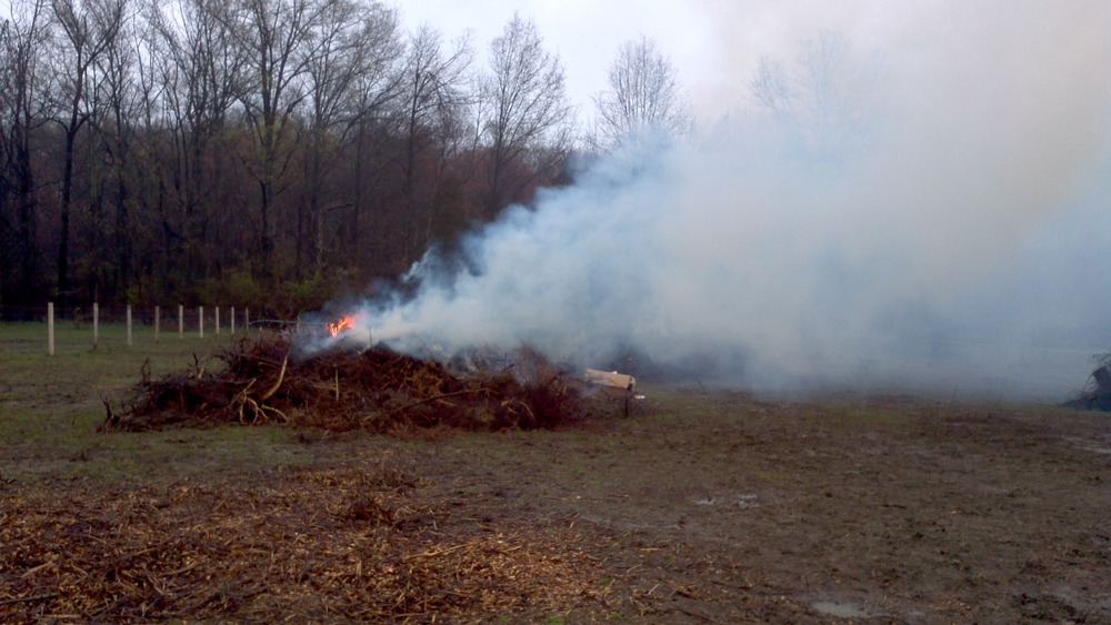 So after months of staring at a pile of trees, I decided to burn them with the help of the local volunteer fire department. Of course the night before it rained and drizzled all day. So needless to say not much burned. On to plan ‘C’ friends with chainsaws and rent a chipper.