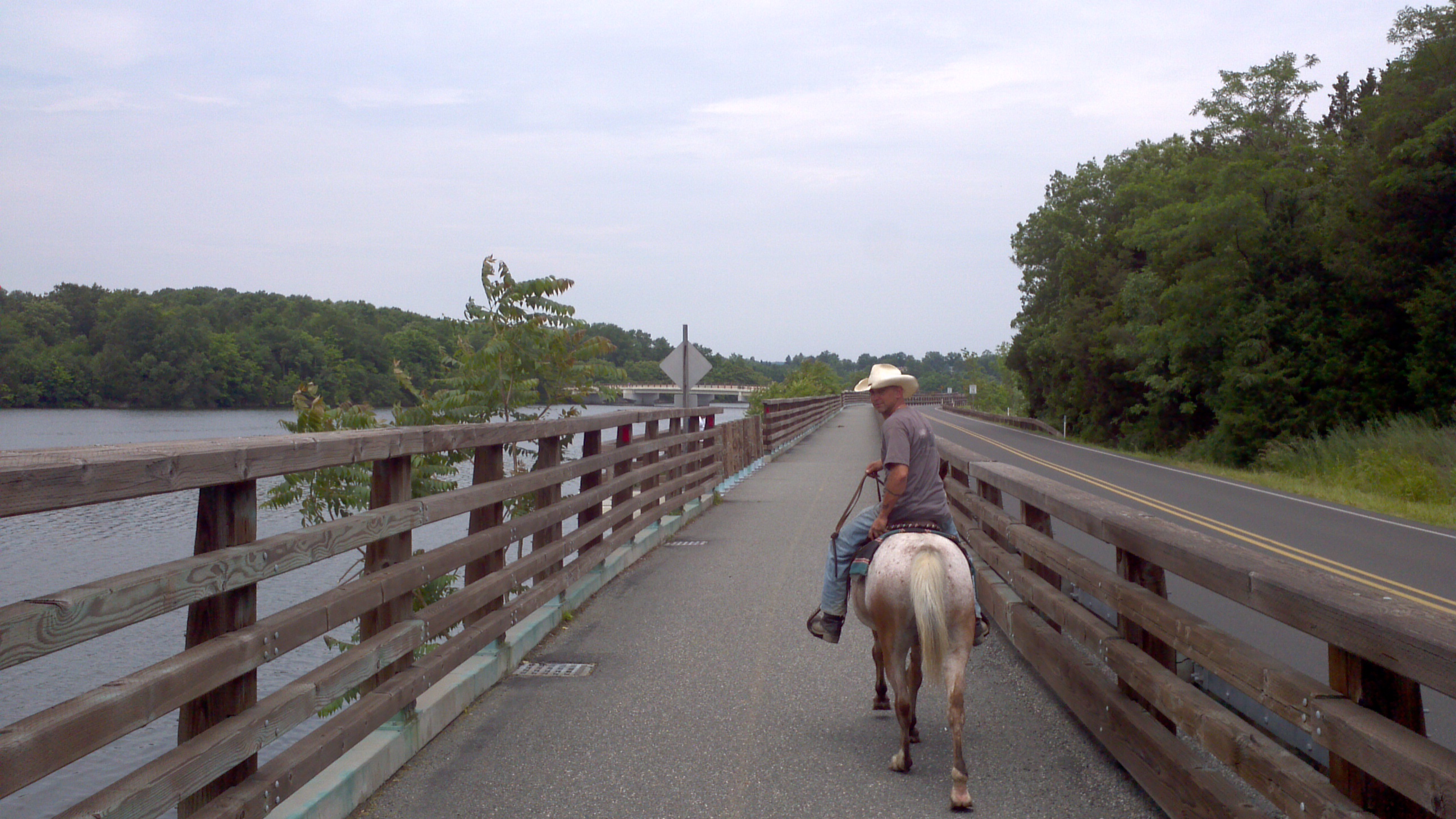 Stopped at the bridge by the gas station for a break. We needed to re-hydrate. The nice man at the shop behind Casey, offered the horses some water.