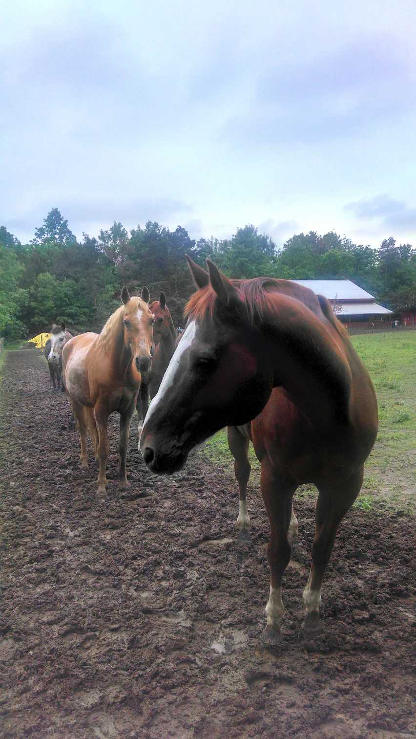 While slowly getting acclimated to eating lush grass the horses in the beginning are only allowed out on the pastures for a few hours per day. This prevents them from getting laminitis and foundering. So as you can imagine they are very excited to get out to the grass.